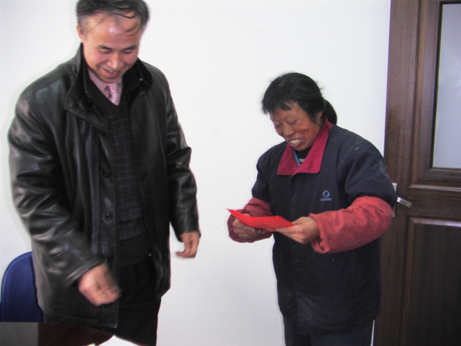 [本网讯]2009年1月19日,上级工会主席一行来到我公司,对我公司的困难职工进行了亲切慰问。金泰公司工会在上级工会的指导下,深入调查,摸清特困职工的基本情况,积极配合上级工会把组织的温暖送到职工手中、心底。图为上级工会慰问困难职工,把慰问金送到困难职工手中。